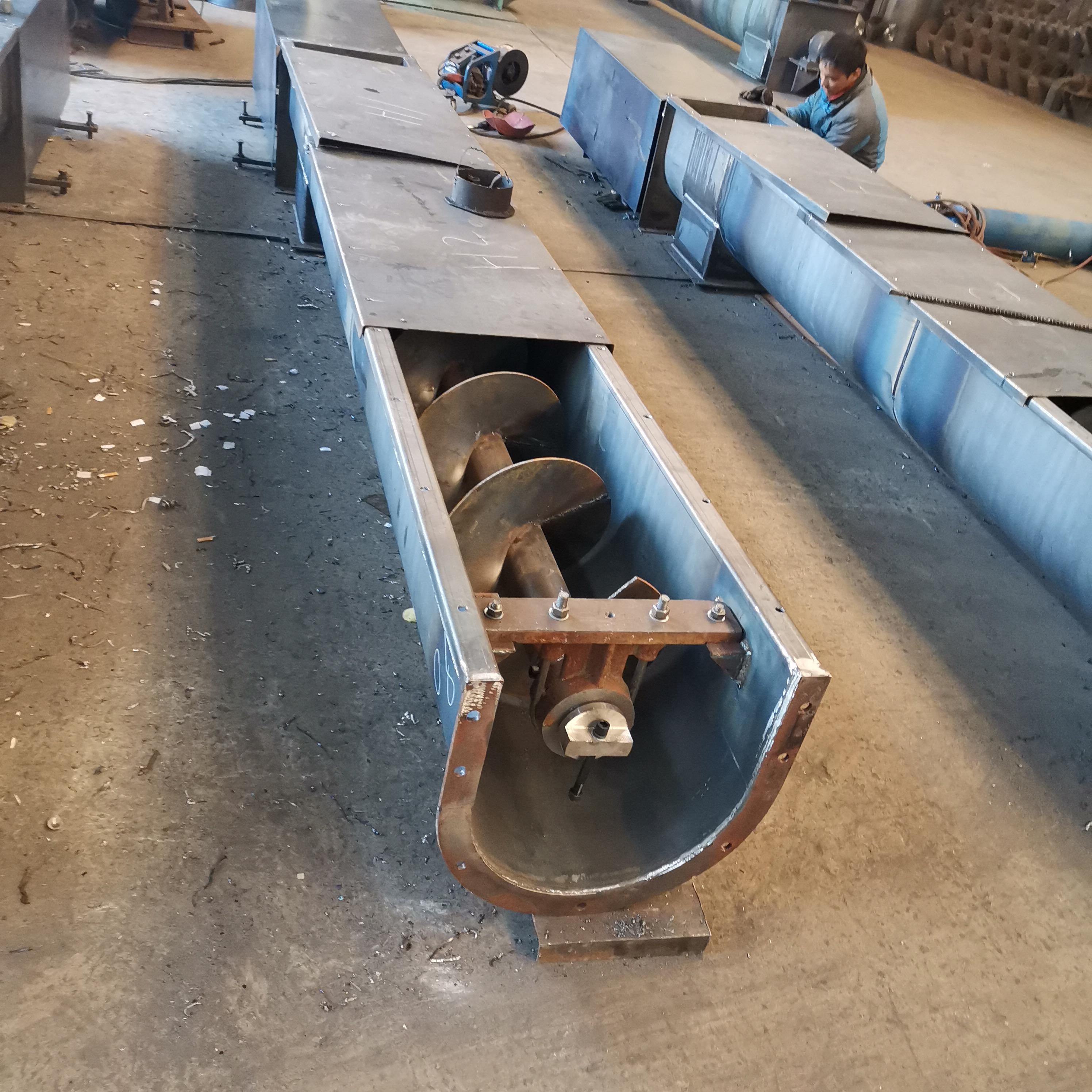 LS300X9000mm的螺旋輸送機分為了3段,現場去直接對接設備,每段中間都增加了一套吊軸,增加了設備的穩固性,減少了同心偏離的問題。LS螺旋輸送機其實就是我們所說的U型槽螺旋輸送機,這一類型的輸送機目前是需求量比較大的,也是我們做的最多的,這一類的設備主要在于它的后期維護和保養,同時也方便檢修,如果物料中間堵了可以直接把蓋子打開進行檢修。注意在檢修前必須要使設備停止運轉并切斷電源,以免造成人員事故。